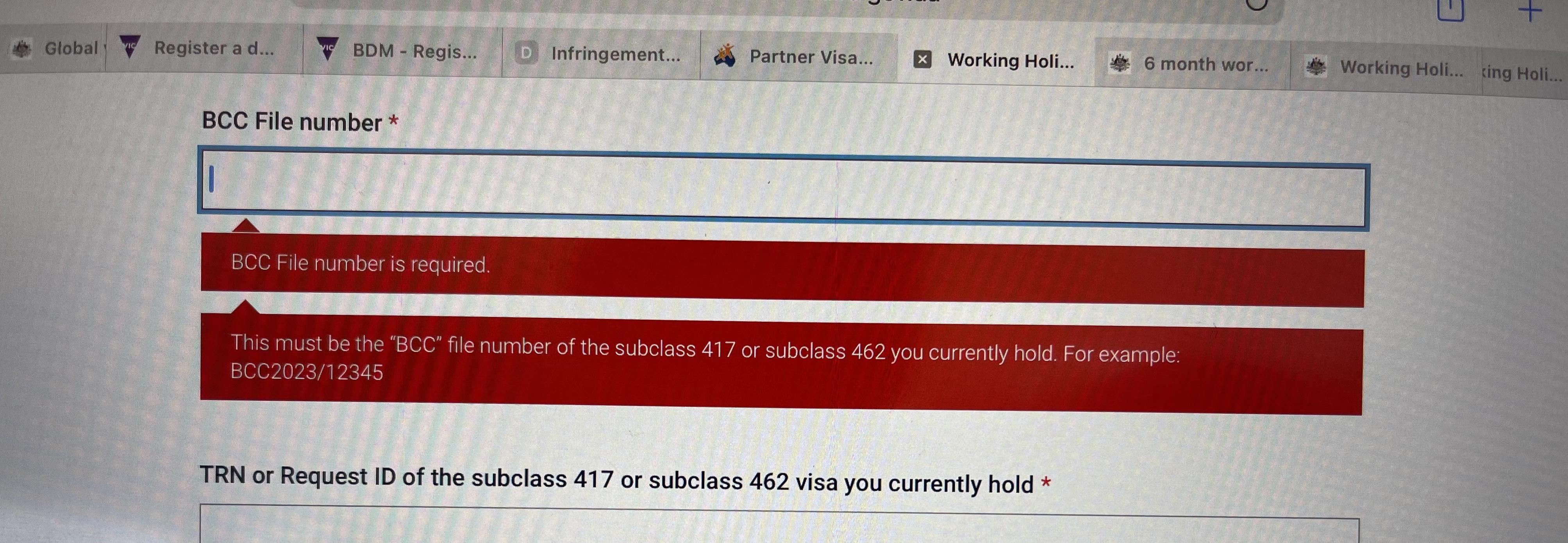 This would be the “BCC” file number of the subclass 417 or subclass 462 you should currently hold. For example: BCC2023/12345