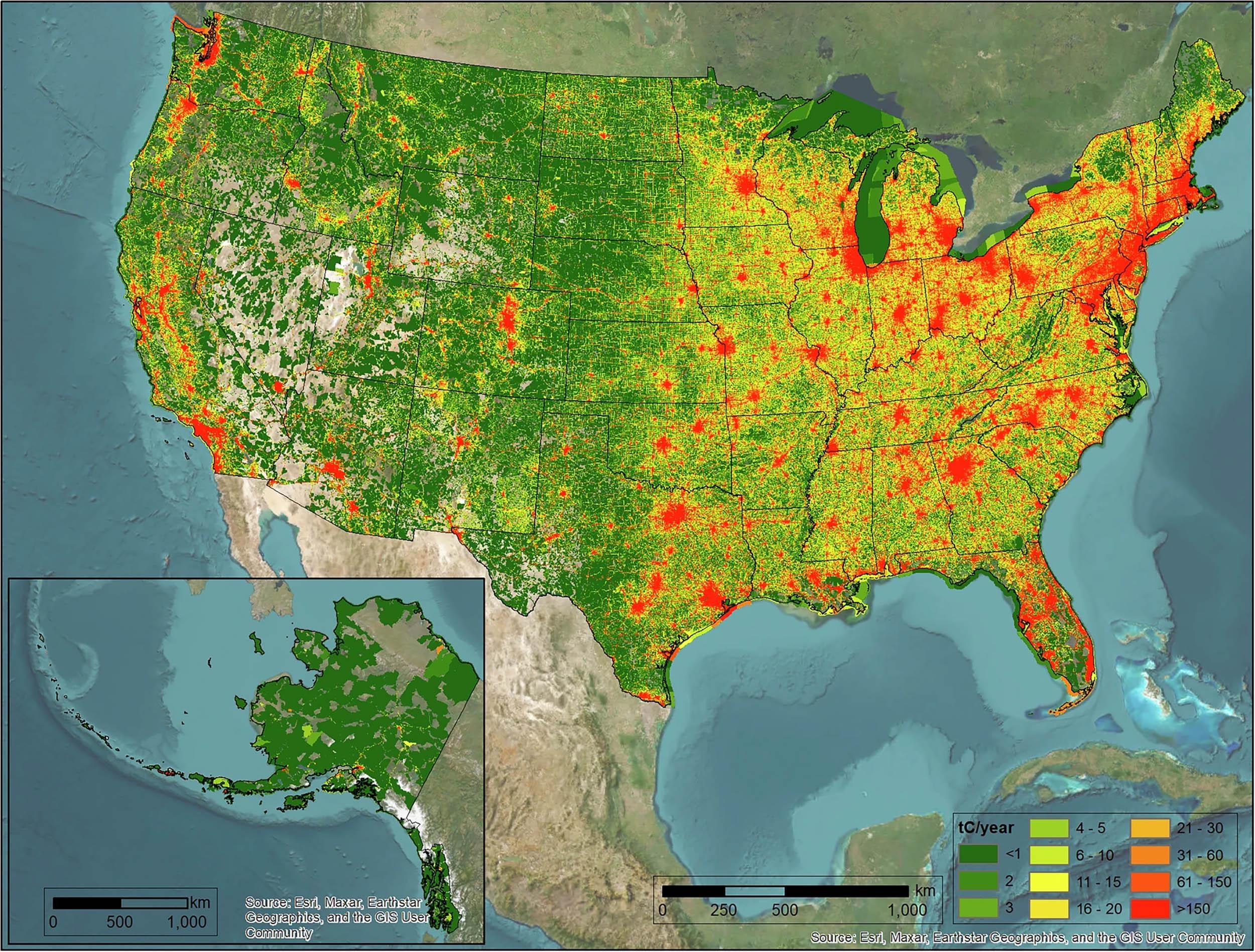 The more roads, the more cars, the more red zones. I can name most every Metro on [this map](https://cff2.earth.com/uploads/2025/12/28153353/co2-emissions_US-map_2010-2022_Scientific-Data_1m.jpg).