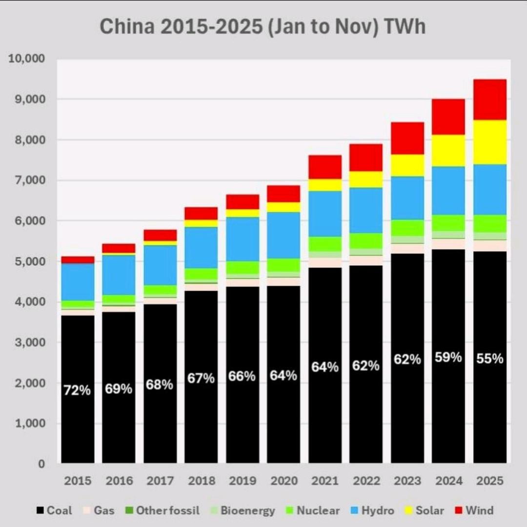 Share Facebook Twitter LinkedIn Pinterest Bluesky Threads It seems 2025 is the year in which China has reduced power production from coal for the first time in modern history. It also has been the largest drop in coal share (-4%) Source: Prof. Lion Hirth on LinkedIn Source: Dividend_O_King