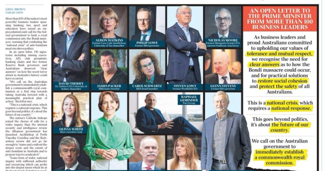 The heavily orchestrated, weeks-long calls for a royal commission are now fuelled by an argument, both stated and implied, that Albanese is resisting a royal commission because he is afraid of what it would reveal. In other words, he is now trying to cover up his failure. The more he resists, apparently, the guiltier he becomes. Anyway, you know who else has resisted calls for an independent inquiry into a historically unprecedented mass killing of Jews on home soil, that might have exposed embarrassing intelligence failures and politically disastrous past calculations? Benjamin Netanyahu.