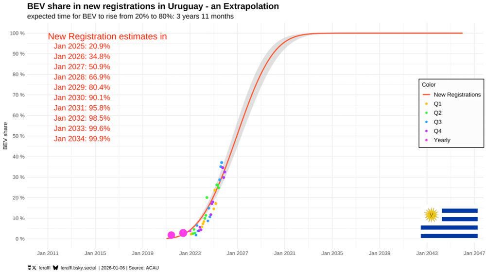 Share Facebook Twitter LinkedIn Pinterest Bluesky Threads 🇺🇾 Uruguay – December 25 – BEV Trajectory 32.5% BEV 2.1% PHEV 65.4% ICE (of which 13.3%p were HEV) Trailing 12 months are: 28.4% BEV 1.5% PHEV 70.1% ICE (of which 10.3%p were HEV) Source: TheSylvaniamToyShop
