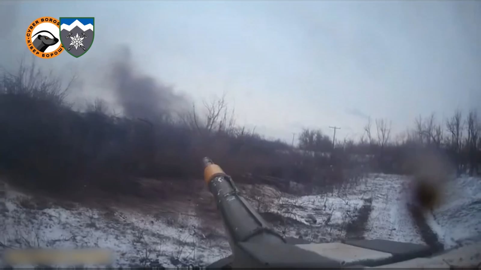 The crew of a Ukrainian T-72 tank from the 10th Separate Mountain Assault Brigade “Edelweiss” is engaging a Russian position in a tree line on the Siversk sector of the front, withstanding hits from enemy kamikaze drones. Jan 2026 [Extended version]