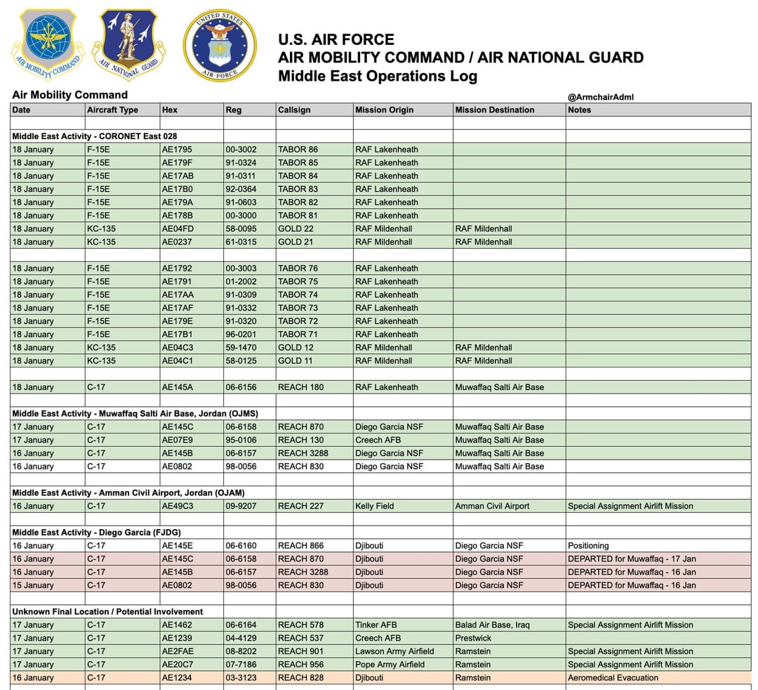 United States redeploying USS Abraham Lincoln toward the Middle East along with F-15E fighter jets from the United Kingdom to Jordan, KC-135 and KC-46 aerial refueling tankers, and C-17 heavy transport aircraft toward the region to support a broader force buildup