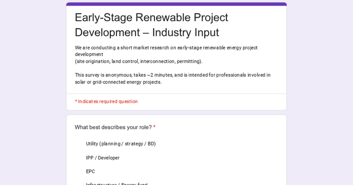 We’re collecting anonymous industry input on early-stage renewable project development (e.g. interconnection, land, permitting, early risk factors).