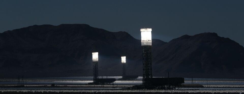 Construction on the Crescent Dunes solar plant, 15 miles from Tonopah, Nevada, began in 2011. It consists of 10,400 mirrors focusing sunlight on a central tower. The sunlight heats molten salt in the towers up to 1,050 degrees Fahrenheit, which is then used to generate steam to make electricity. Leaks in its salt tanks repeatedly shut down operations, leading it to file for bankruptcy in 2020.