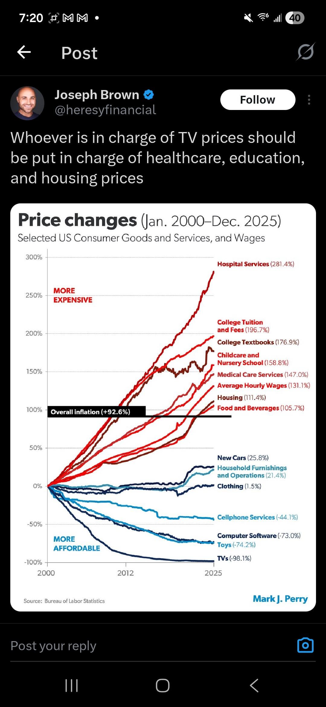 Jokes on us all. The prices will go up bc we dont really build Tvs here, we important them so will catch tariffs. Healthcare is truly domestic but we allowed capitalist to inflate the prices bc we suckers.