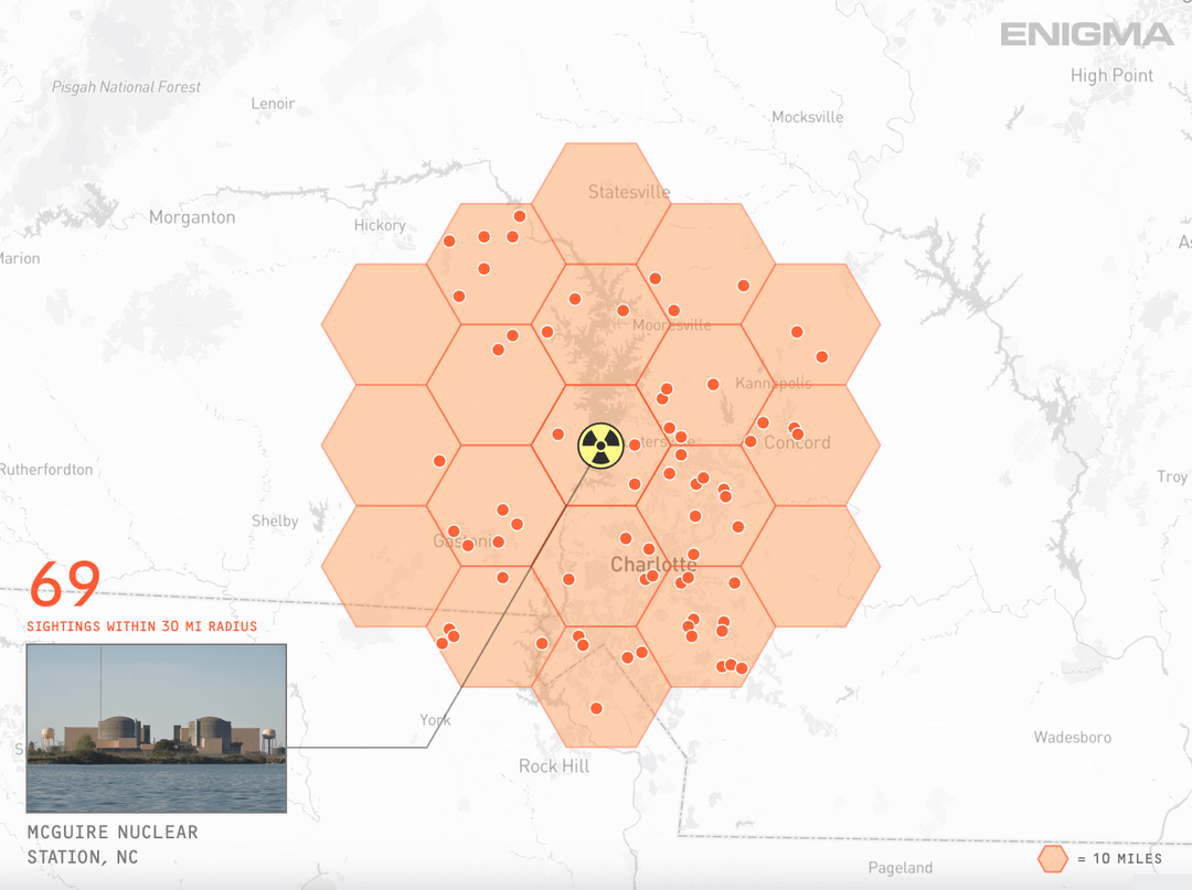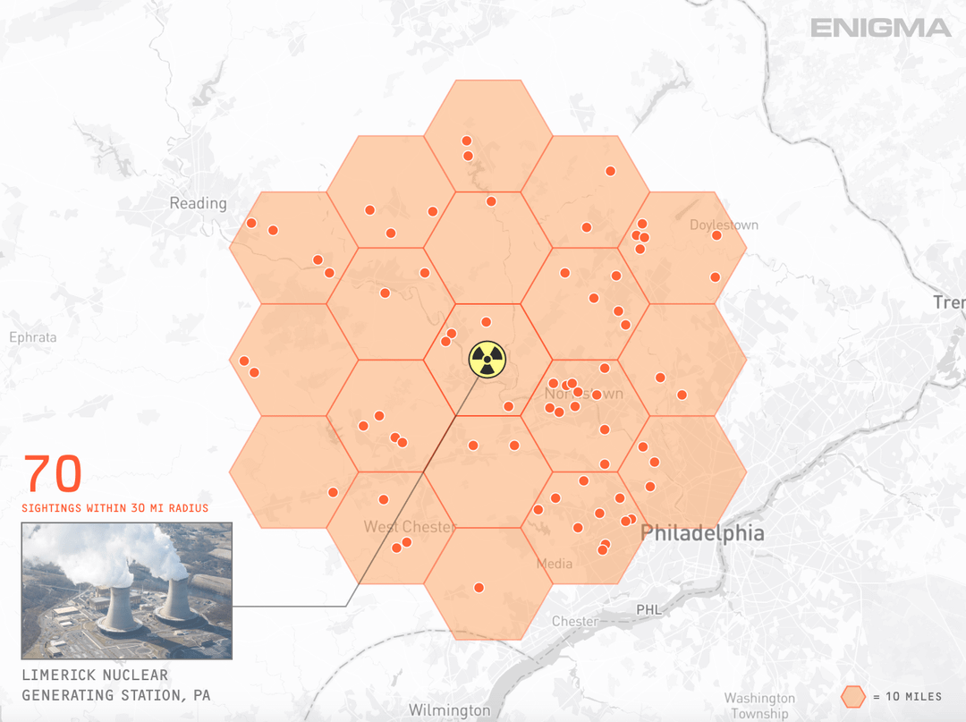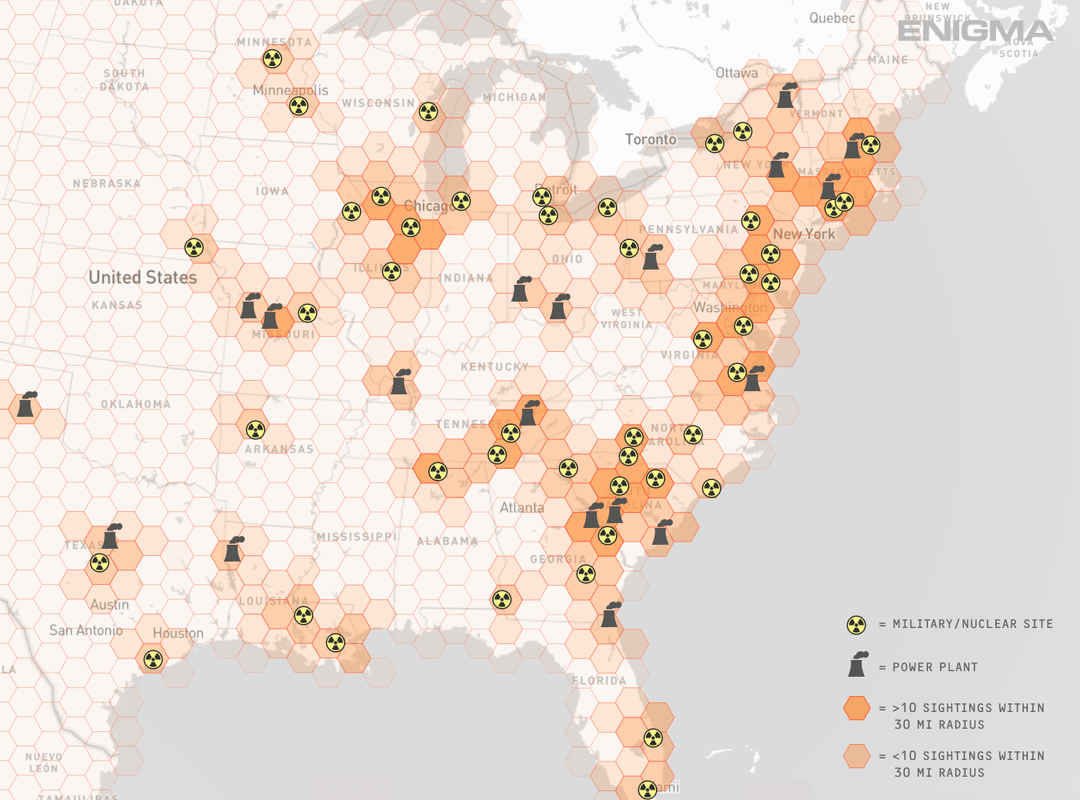 This is part of a larger analysis. Below are a few localized examples of reported aircraft and drone activity within ~30 miles of individual power generation sites. The final image zooms out to a broader U.S. view for to show density. Curious how you all think about airspace monitoring around power facilities?