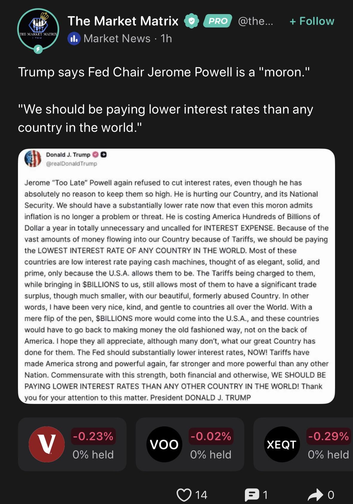 It’s such a shame that the economy has gotten so bad that he desperately needs to lower rates so things look a little better.