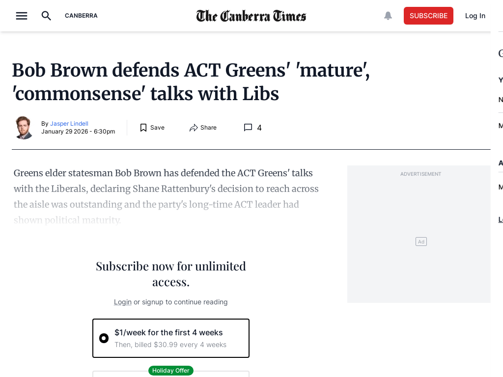 Bob Brown defends ACT Greens’ ‘mature’, ‘commonsense’ talks with Liberals