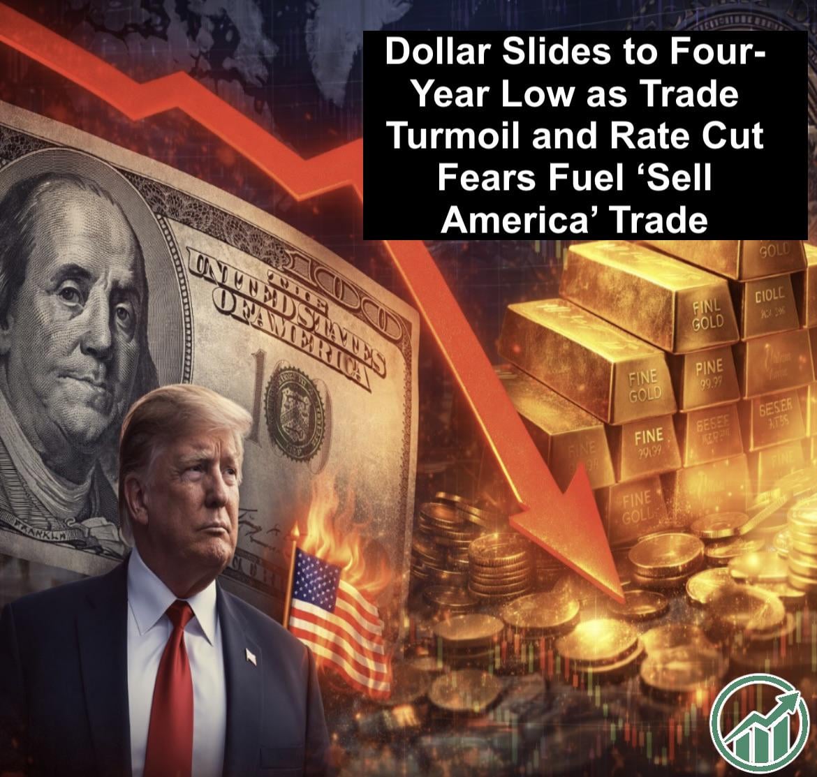 The U.S. dollar is sliding sharply, hitting a four-year low despite a relatively strong stock market. The greenback has fallen more than 3% since mid-January, pressured by renewed tariff threats from President Trump, rising risks of a government shutdown, and investor concerns about policy unpredictability. Economists say these factors are undermining confidence in the dollar, prompting investors to move into hard assets like gold, which has surged to record highs.