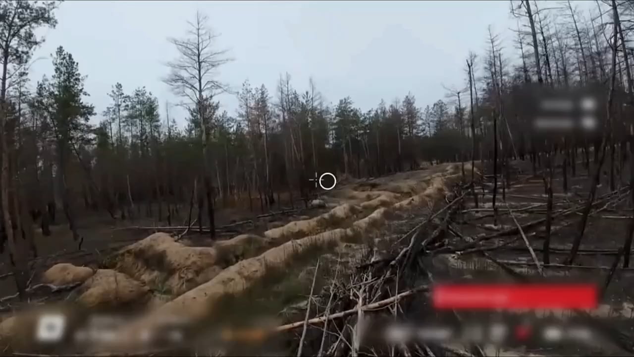 Ukrainian soldiers assault an enemy trench system with support from a small Black Hornet reconnaissance drone. Likely after hearing the drone, the enemy began to retreat. Lymansky Forest, Donetsk Region