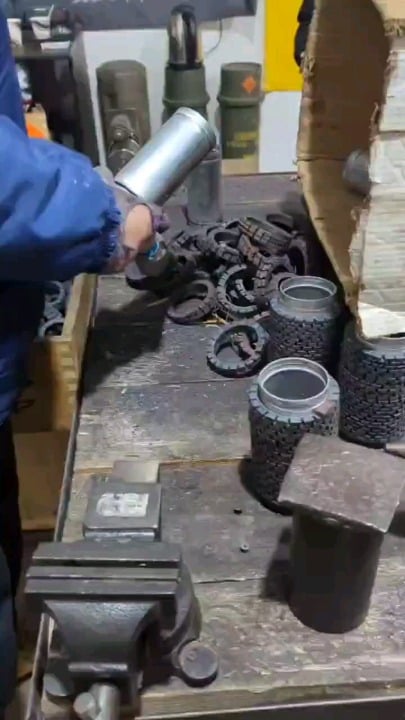 Ukrainian fragmentation drone munitions are fabricated. Preformed spirals of striking elements placed or wound on a steel pipe are secured with retaining rings. There is a large internal volume for explosive, so these devices will be powerful.