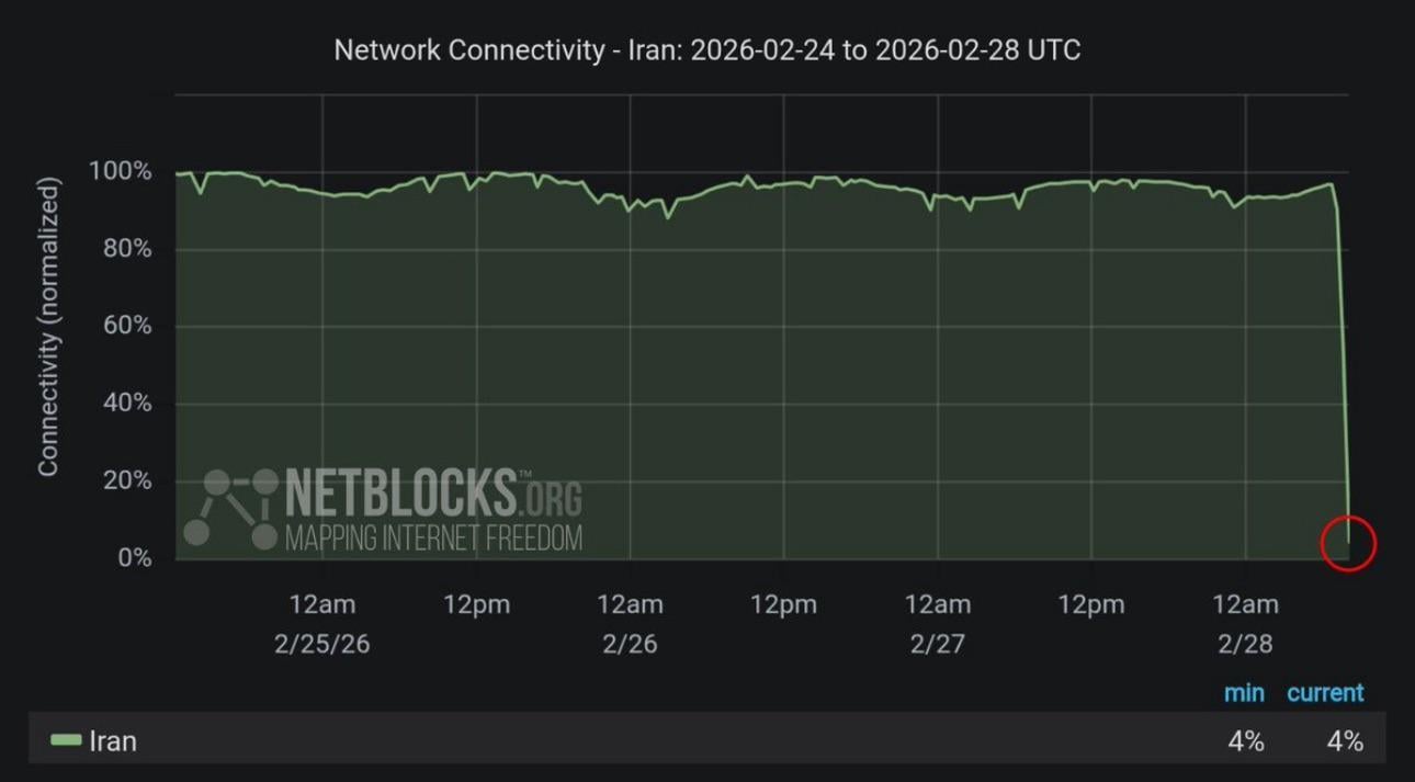 Iran is experiencing a near-total internet blackout, with connectivity down to about 4% of normal levels Source: Baconkings