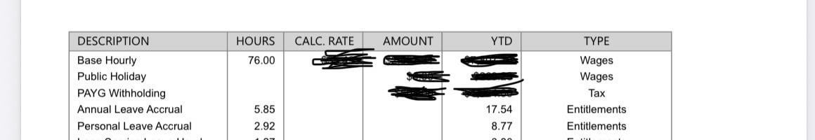 That’s an MYOB payslip. MYOB shows the current balance on the right hand side as what leave is available. It’s extremely badly implemented, because it looks like a YTD figure.