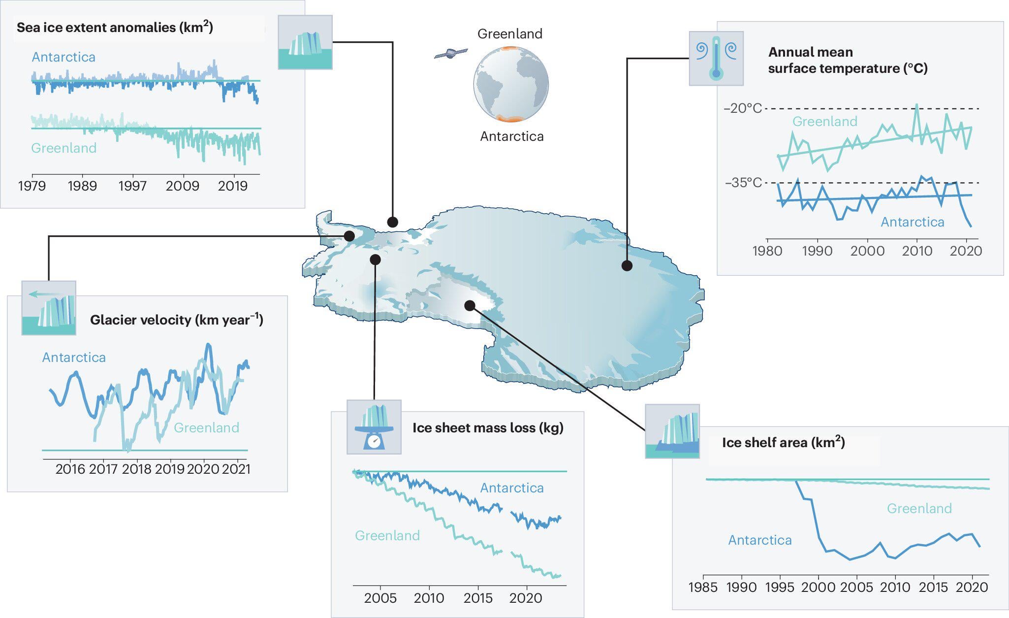 Antarctica undergoes ‘Greenlandification’ as ice melt accelerates. The term refers to the unprecedented retreat of Greenland’s outlet glaciers and longer surface melt seasons.
