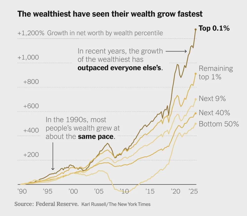 From 1990-2000, the top 0.1% grew about twice as fast as the bottom 3 categories. Since then, the next 9% looks to have caught up a hair, while the bottom 50% has fallen behind what you’d expect if everyone grew at the same growth rates. But since this is looking at wealth and since the bottom 50% have a disproportionately lower amount of money invested (i.e., near zero) compared to the top 0.1% (nearing 100%) I’m actually surprised the gap is this small.
