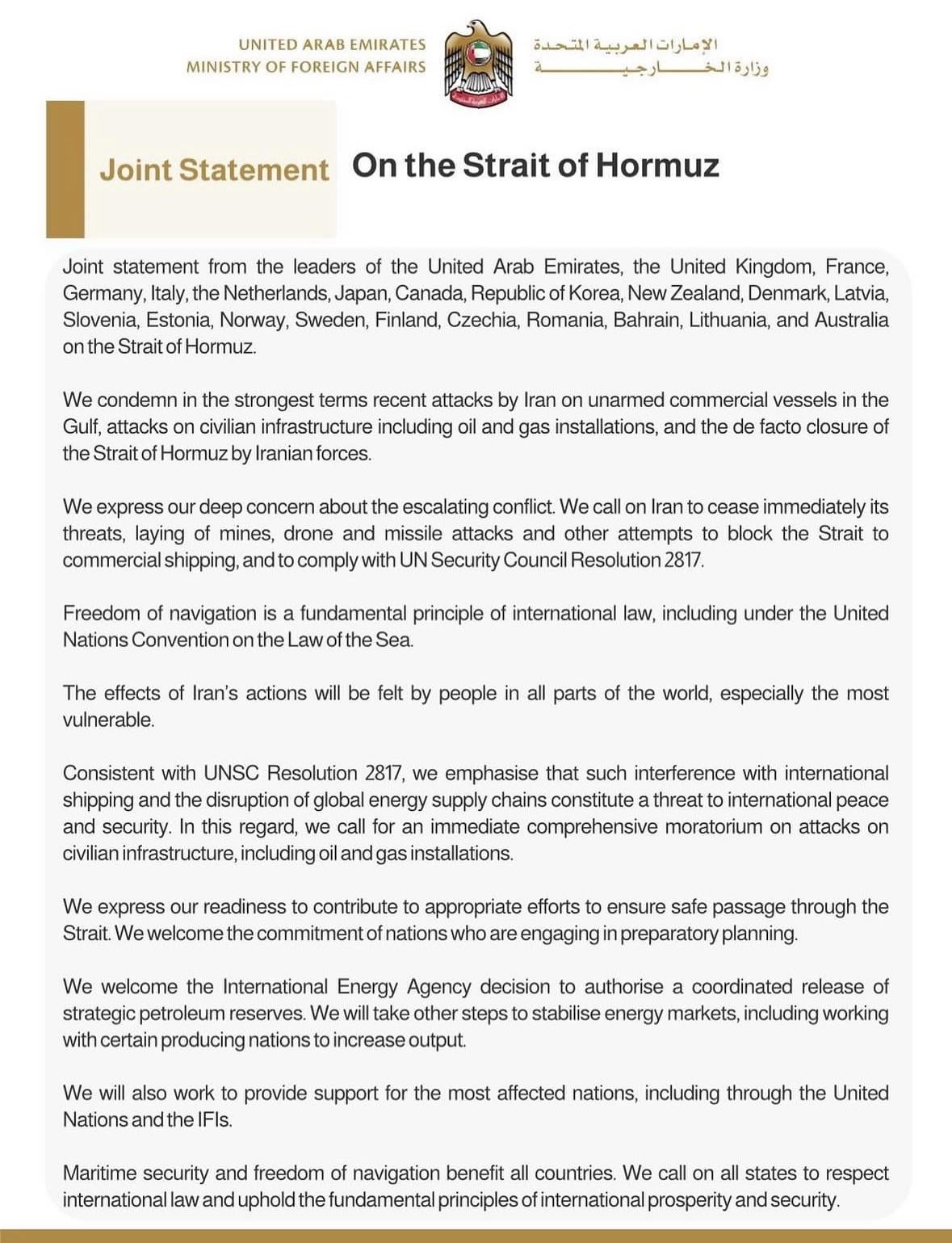 Joint Statement regarding Strait of Hormuz shipping