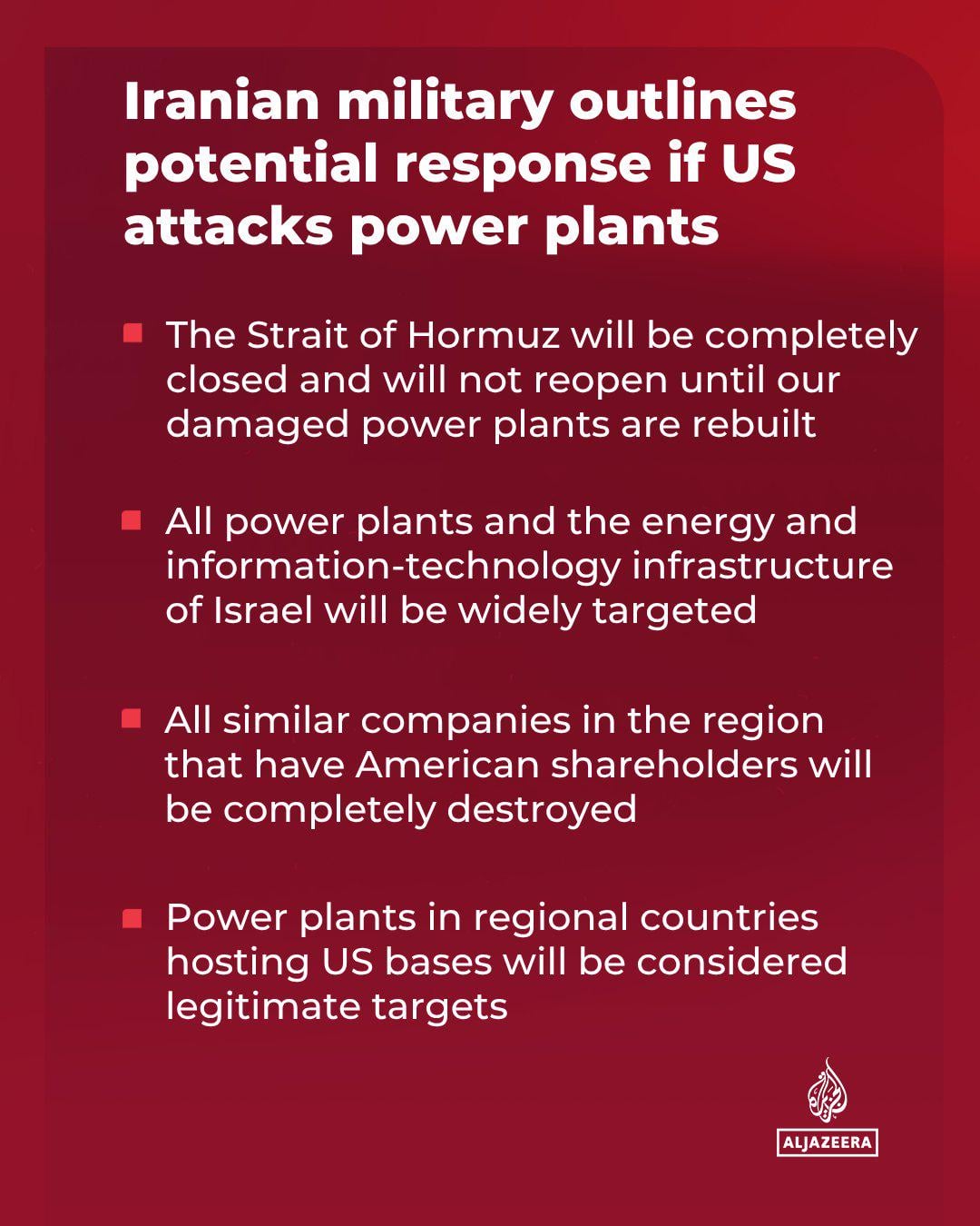 Iran: Says it would permanently shut down the Strait of Hormuz if its energy sites are attacked Source: Gold-Cantaloupe-9534