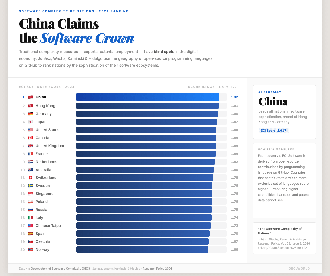 A new paper in Research Policy (Juhász, Wachs, Kaminski & Hidalgo, 2026) tackles this by building a Software Economic Complexity Index from GitHub data. Rather than looking at individual programming languages, they cluster languages that are frequently used together in repositories (HTML/CSS/JavaScript), a data science stack (Python/Jupyter Notebook), or low-level systems tooling (C/Assembly/Makefile). They then measure which countries have a revealed comparative advantage in which clusters, and apply the standard economic complexity method to rank nations by the diversity and sophistication of their software ecosystems.