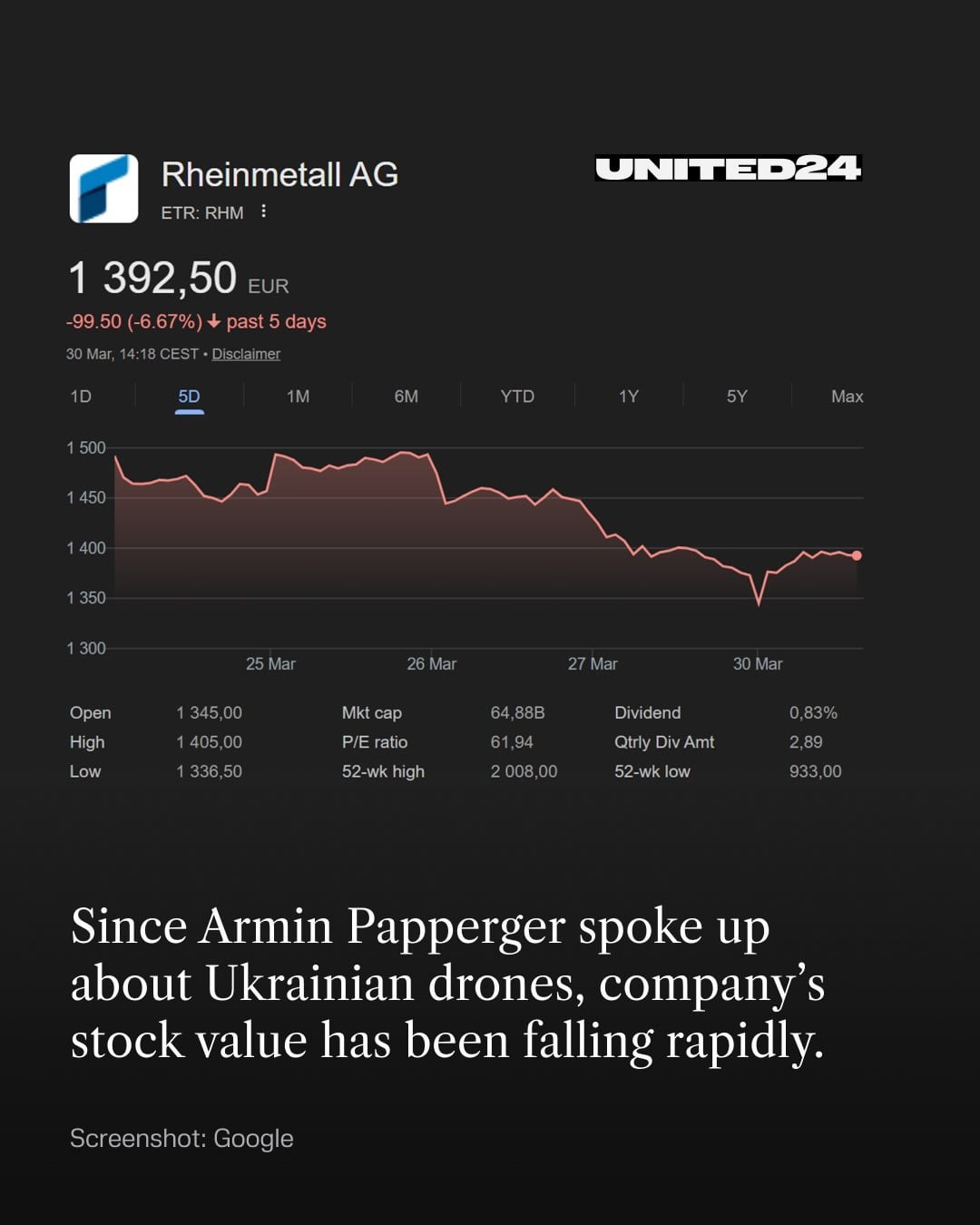 No wonder the stock is plummeting. His comments just showed how behind the times these old defense companies are. Many new defense technology companies, like Germany’s Helsing, may soon offer products that surpass anything Rehinmetal has for significantly less.