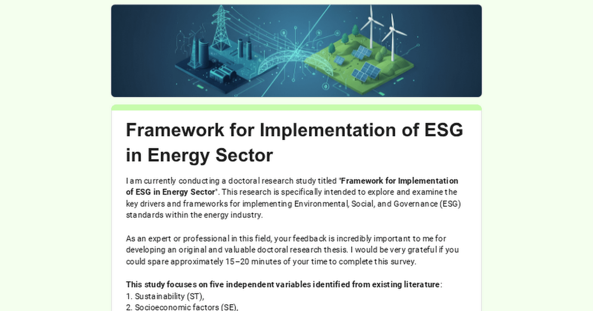 I am currently conducting doctoral research on the "Framework for Implementation of ESG in the Energy Sector".