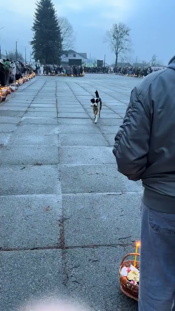 Short video of a clever and mischievous dog, who made off with a sausage from one of the festive food baskets as families lined up for the traditional blessing in Kyiv.