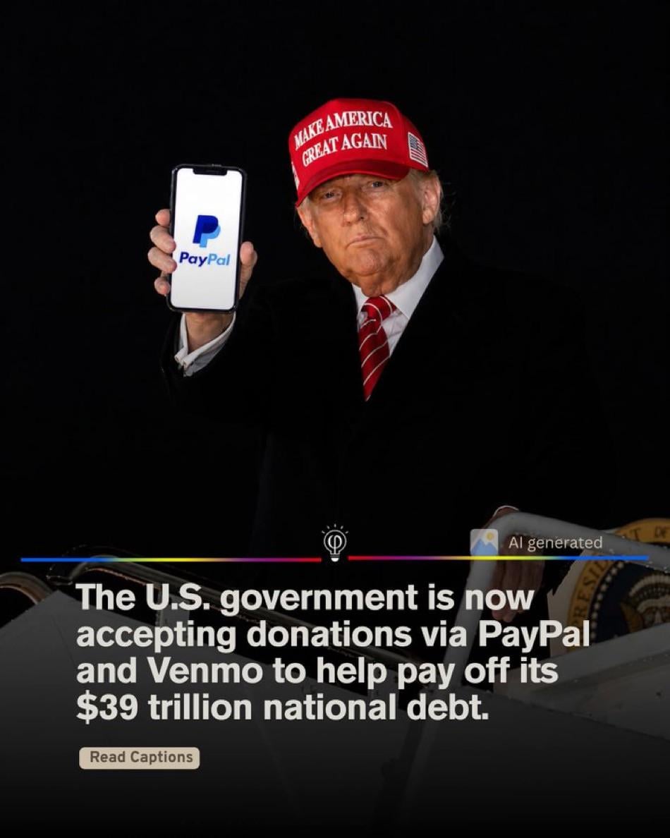 This is clearly a scam. I highly doubt this would go towards the national debt. Would likely be funneled into a Trump family or friends’s direct account.